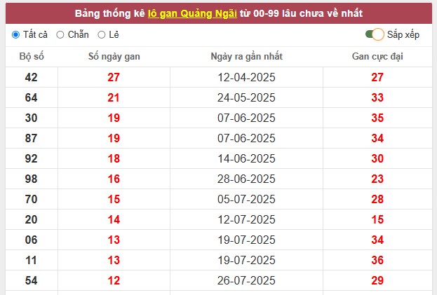 Thống kê đuôi giải đặc biệt Quảng Ngãi lâu chưa về nhất: Đuôi 0 gan 10 ngày – Đuôi 1 gan 2 ngày – Đuôi 2 gan 3 ngày – Đuôi 3 gan 12 ngày – Đuôi 4 gan 0 ngày – Đuôi 5 gan 4 ngày – Đuôi 6 gan 1 ngày – Đuôi 7 gan 19 ngày – Đuôi 8 gan 9 ngày – Đuôi 9 gan 5 ngày.